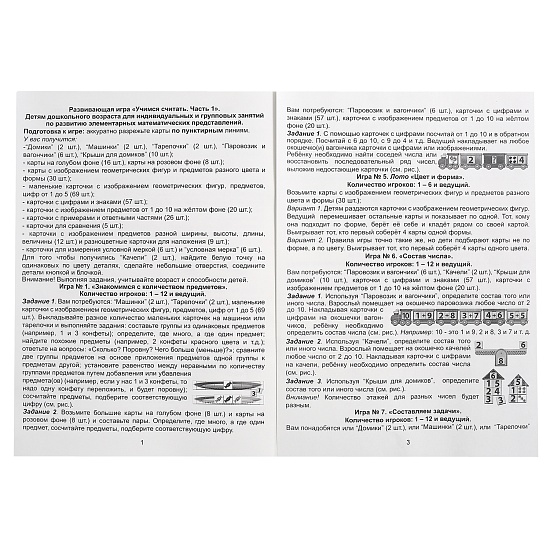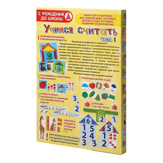 Настольная игра "Учимся считать" - это очень интересная обучающая игра для нескольких игроков. Она познакомит детей с цифрами и счетом, с основами арифметики и научит считать от 1 до 10 и обратно. В игровой форме ребенок сможет самостоятельно составлять и решать простые математические задания (в пределах 10). Игра подойдет как раздаточный и демонстрационный материал для дошкольных учреждений, так и для домашнего пользования. Аксессуары изготовлены из плотного высококачественного картона. Все детали окрашены нетоксичными безопасными для здоровья детей красителями, которые долго время сохраняют свою яркость.